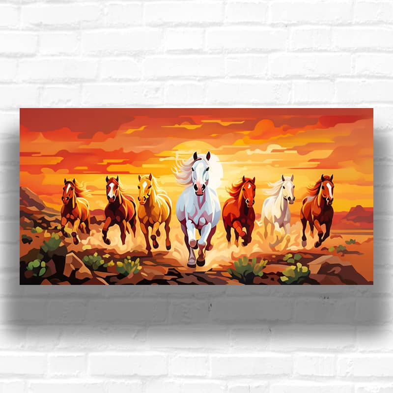 This 8 running horses painting by numbers bursts with movement and color. A white horse is depicted in the center, gallops decisively forward. Next to her, seven more horses gallop, each with warm colors reflecting the sunset. The extra large horizontal canvas is designed to show the full scale of the scene. Orange, red, and yellow clouds fill the sky, adding depth to scenery. This paint by numbers design challenges you to capture motion through color blocking and tonal shifts. The equine art aesthetic works because it combines wildlife energy with nature’s most theatrical lighting.