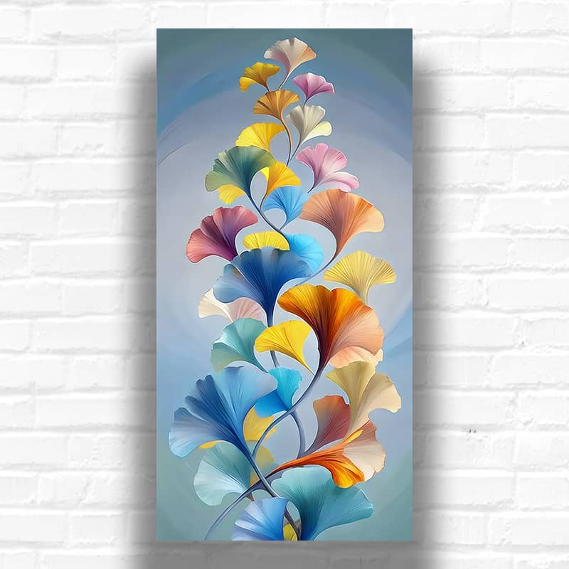 Large canvas dimensions give each ginkgo leaf room to breathe. The design shows intricate veining, especially in warmer sections where coral and amber tones dominate. Overlapping leaves create dimensional depth. This colorful painting offers a creative decor solution that bridges ginkgo leaves scene with contemporary art. The vertical format makes abstract ginkgo leaf wall art that commands attention.