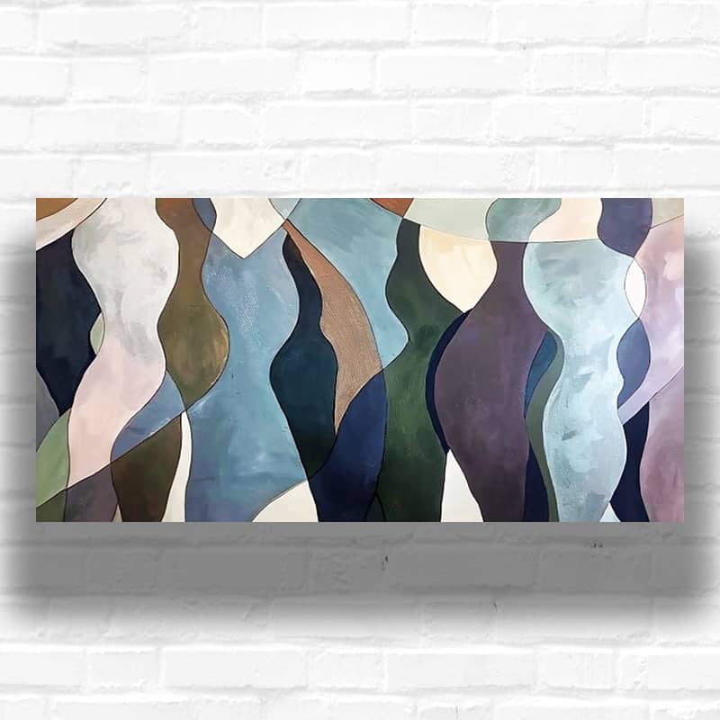 This largest paint by numbers features abstract human figures rendered in flowing forms. The horizontal canvas presents overlapping silhouettes that weave together like a visual dance. Muted colors such as: dusty blue, sage, taupe, navy, cream, and soft lavender. They create a contemporary artwork, that is sophisticated without being loud. Each figure is bent, creating a sense of movement and connection between the bodies.