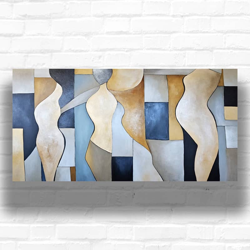 The Abstract Human Form – paint by numbers kit, this largest artwork shows an abstract art human figures in cubism style. The scene consists of intertwining geometric shapes in various shades of blue, gray, beige, and white. The shapes suggest curves and contours of human forms, particularly reminiscent of torsos and limbs.