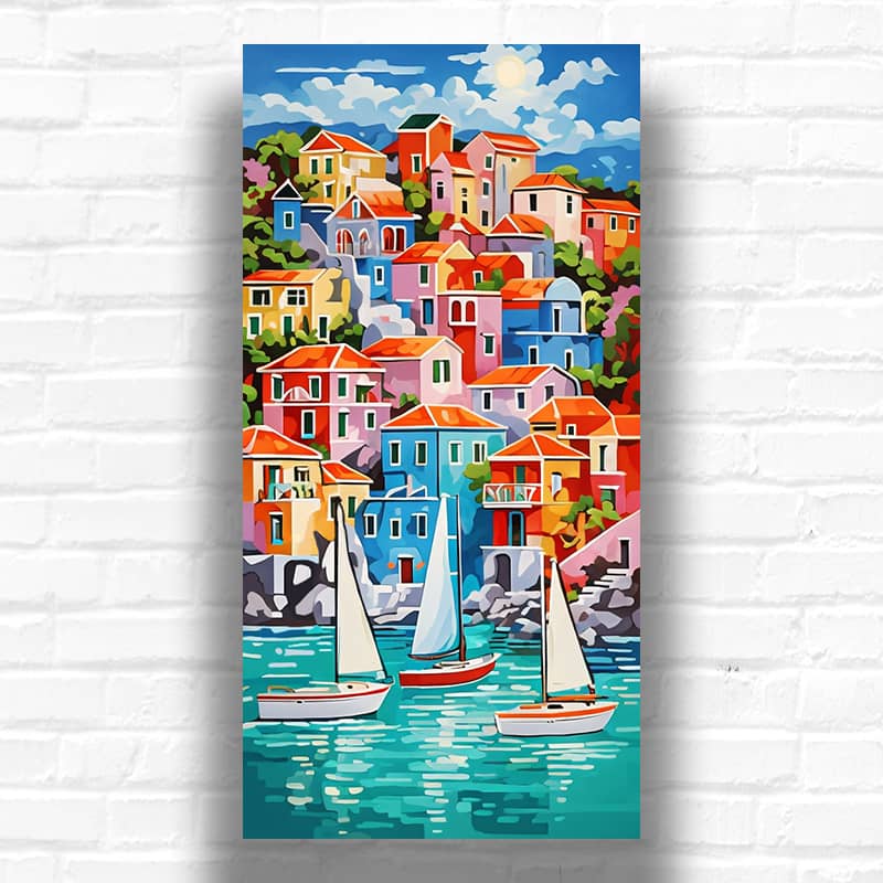 This abstract village paint by numbers turns a coastal town into a geometric celebration of color. Buildings cascade down the hillside in playful blocks—blue walls meet orange roofs, pink houses nestle against yellow ones. The extra large vertical canvas captures the entire scene from sky to sea. Turquoise water reflects the bright architecture above. Three sailboats add movement to the composition.
