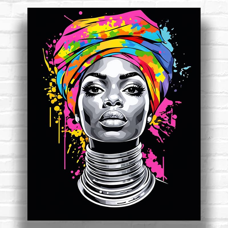 African Queen in Color – paint by number kits, this modern artwork show a portrait featuring a woman in a monochrome style, contrasting dramatically with a vibrant, colorful background and headwrap. The female wears a traditional African neck ring collar (resembling those worn by Ndebele women) and a colorful head wrap (gele) that explodes with splashes of pink, yellow, blue, green and orange in a paint-splash effect.