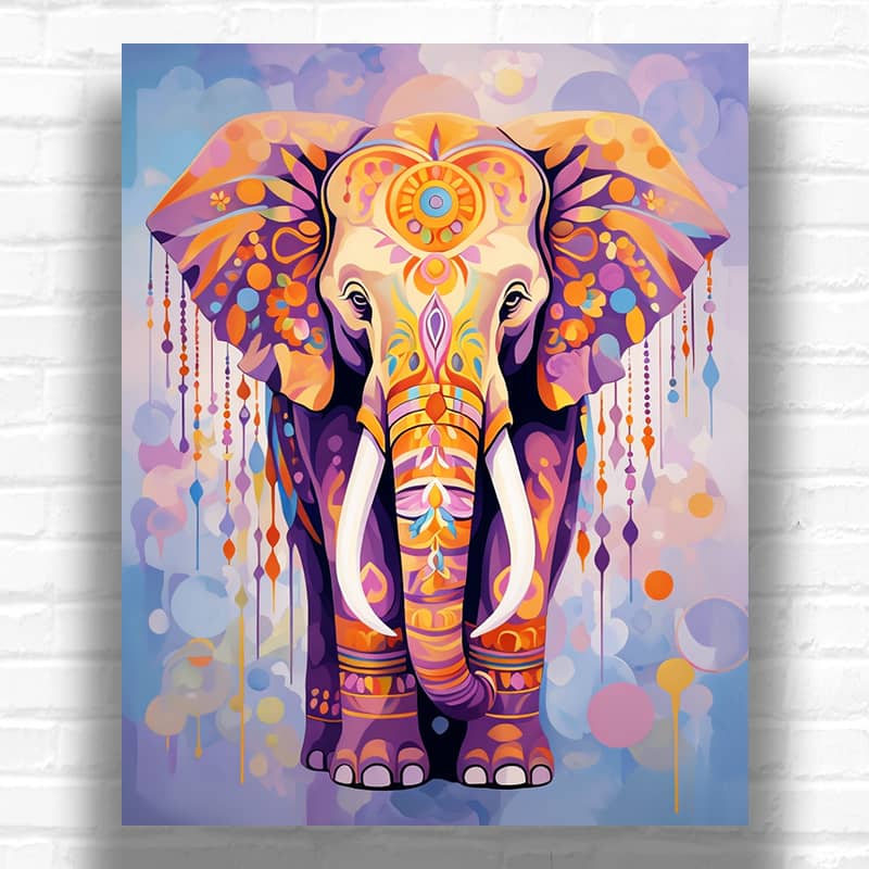 This Asian Elephant at the Flower Holiday paint by numbers kit features a ceremonially decorated elephant with bright body painting. It has a circular mandala on the forehead, and the floral patterns on ears, decorative trunk bands, and ornamental leg designs. This the design uses rich purples, vibrant oranges, soft pinks, sunny yellows, and turquoise colors. This boho elephant painting includes white tusks, gentle expressive eyes, and cascading beaded strands creating festival atmosphere.