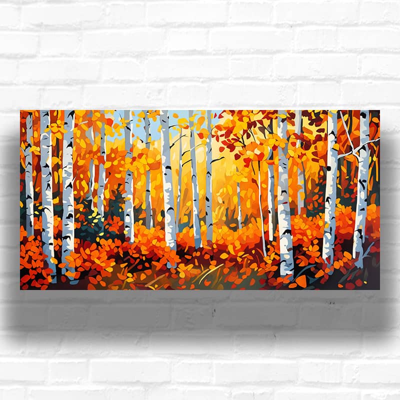 The Birch Forest in Autumn – paint by numbers kit, this very large artwork shows an autumn forest scene. The scene is a birch grove with white trunks and bright foliage in the autumn tones of red, orange and yellow. The forest vegetation has warm tones, creating a rich tapestry of autumn colors.