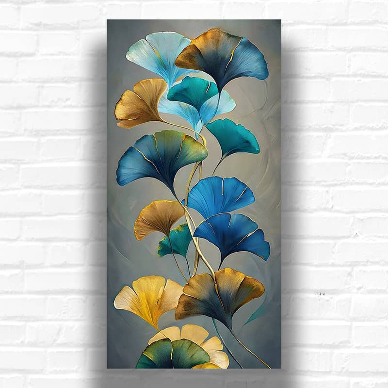 Blue and Brown Ginkgo Leaves – paint by numbers kit, this modern large artwork shows an elegant ginkgo leaves in stunning shades of blue, teal, golden brown, and cream, each outlined with delicate gold accents. The leaves cascade vertically down a soft gray background, creating an organic composition. The fan-shaped foliage overlaps gracefully, adding dimensional depth and natural movement.