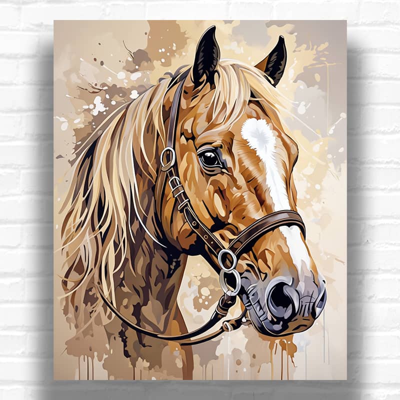 Brown Horse Portrait paint by numbers kit, this modern artwork show a chestnut horse portrait with flowing blonde mane and gentle expression. The horse wears a leather bridle with metallic accents done in an artistic style on background with paint splatters. Rich brown and cream tones create warmth and elegance in this brown horse wall art.