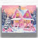 Christmas Candy Cottage – paint by number kits, this modern artwork show a snow covered cottage with a prominent “Candy Cottage” sign. The cottage has two gabled roofs with snow-capped peaks and lit windows, creating a warm, inviting atmosphere. The exterior is painted in a pink color, contrasting with the snowy environment. Various Christmas decorations adorn the cottage, there are wreaths, string lights, and oversized candy canes.