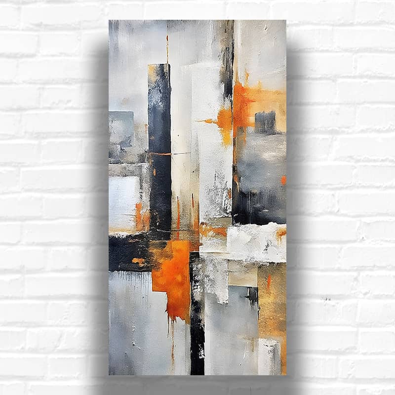 The Color Block Abstract Painting – paint by numbers kit, this big artwork shows a vertical abstract scene with layered geometric forms in charcoal, orange, cream, and gray. Drips and textured brushstrokes create depth… The composition balances structure with spontaneity, combining architectural elements and organic paint flow for contemporary appeal.