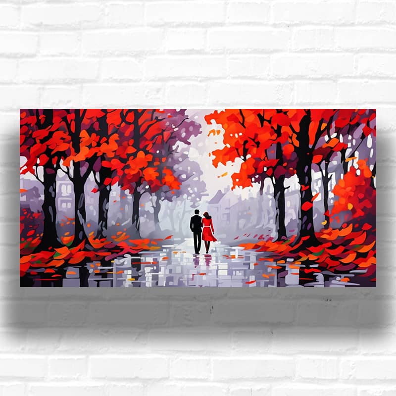 The Fall Walk NYC paint by numbers shows a couple’s journey through autumn city streets. This large abstract canvas features fiery red and orange foliage contrasting against dark tree trunks and misty urban architecture. The design depicts a wet street reflecting seasonal hues, and the scattered leaves create a texture. New York buildings emerge softly in the background, giving this horizontal canvas depth and atmosphere. This modern style of fall that was perfect for cityscape lovers.