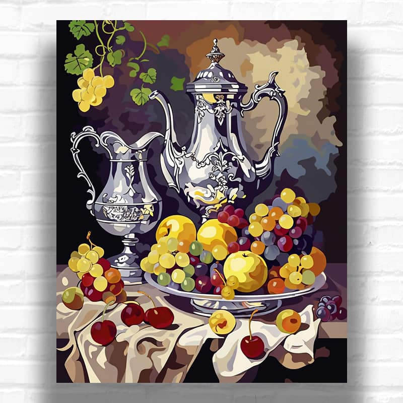 This Fruits and Wine in Antique Vases painting shows off old silver stuff in the middle. An ornate coffee pot with baroque scrollwork and a cool top part stands out the most. Accompanied by a matching pitcher with elegant curved handles. The metallic surfaces display masterful rendering of highlights and reflections. This paint by numbers kit perfectly demonstrates the elegance of traditional still lifes.