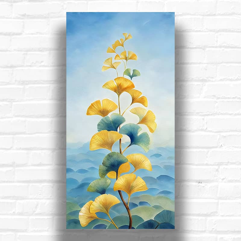 The big canvas displays layered mountains in soft blues and greens that fade into a misty distance. It creates an amazing background for the ginkgo biloba artwork. The design combines foliage art with landscape elements, and the elegant design uses a limited palette. It makes this botanical wall art suitable for modern interiors. This leaf artwork adds natural beauty indoors through its creative decor approach. They combine detailed foliage with simplified background elements and will not overload the space.