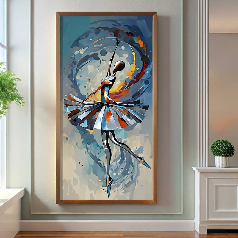 The design has a bright color scheme. Rich blues dominate the background. Sharp geometric fragments in red, orange, and gold form her flowing costume. This abstract ballerina becomes large wall painting art that commands attention in any display space, offering a creative hobby that results in gallery-worthy home decor.
