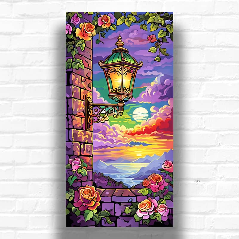 This Lantern with Flowers paint by numbers shows a beautiful moment, where nature meets art. A classic forged lantern casts warm light from an old stone wall, surrounded by a bright flowers. Pink and orange flowers twine around a vintage lantern, their petals beautifully complementing the textured brickwork. In the background, a stunning sunset is depicted over calm waters of purple, orange, and turquoise.