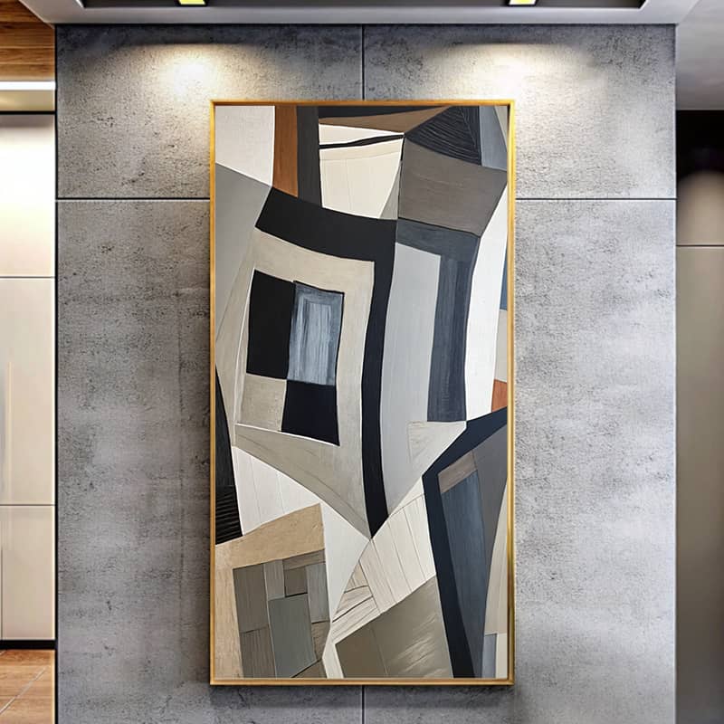 This large modern abstract painting on a large canvas depicts intersecting geometric shapes in a vertical format. Rectangles are joined at odd angles, creating depth through layering rather than conventional perspective. The abstract design combines wood grain textures with solid blacks, warm beiges, and cool grays. Each shape was painted to suggest architectural elements—doorways, beams, walls—but nothing resolves into a recognizable structure.