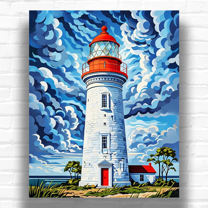 Lonely Lighthouse at Sea paint by numbers kit, this artwork show that the focal point of the painting is the bright beacon surrounded by a stormy sky. The lighthouse is white with a bright red top. The lighthouse has three visually perceptible levels: a lower level with blue door, the second level with two window in the middle and the third level a cylindrical tall room with glass lantern encased with round dome and parapet as the crowning head.