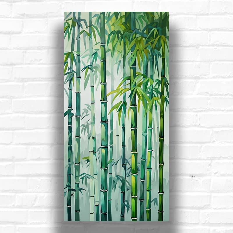 The Misty Bamboo Forest – paint by numbers kit, this large size artwork show a bamboo forest scene. Several bamboo stalks of varying thickness are shown in shades of green, from light sage to deep emerald. The stalks rise vertically through the composition, with some appearing closer and more detailed in the foreground, while others fade into a misty background. Delicate bamboo leaves branch out from the stalks, creating a sense of gentle movement.