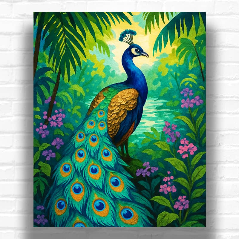 The Peacock in Jungle art shows a peacock with very big tail feathers hanging down. These feathers have big spots that look like eyes in bright blue, gold, and dark blue. The painting has a rich jungle around it with palm leaves that hang over, making a frame from nature. There are clumps of pink and purple flowers all over the bright green leaves. The artwork catch a small lake shine in the background, giving the landscape of a tropical paradise a special atmosphere.
