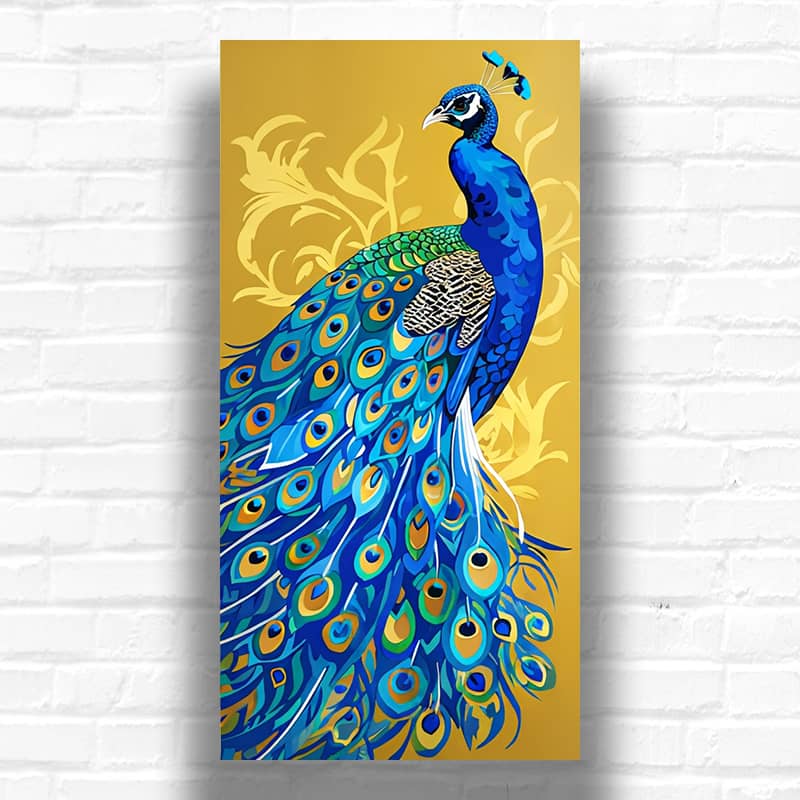 Peacock in Radiant Glory – large size paint by numbers kit, this modern artwork show a bright blue bird with intricately detailed iridescent tail feathers, set against a golden background with delicate floral patterns. The large artwork showcases the peacock’s regal posture and fascinating color palette.