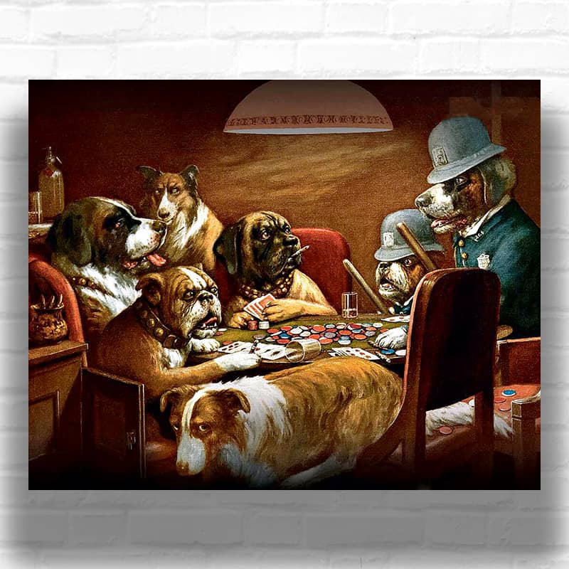 Pinched with Four Aces by Cassius Marcellus Coolidge 1904 captures the Dogs Playing Poker legend at its peak. In this famous poker painting, Coolidge stages a gambling scene where Poker Dogs clutch Four Aces just as authority storms the room. The poker table scene is crowded, tense, almost cinematic. This classic dog artwork blends humorous art with vintage gambling art, forming a retro poker art narrative that still dominates wall art and decor conversations.