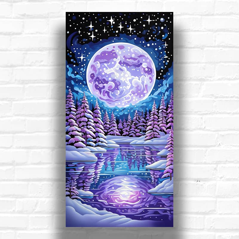 This Pink Moon in the Sky paint by numbers kit will bring a magical winter landscape to life. The pink moon hangs in the night sky, casting its glow across a frozen lake surrounded by snow-covered trees. Each brushstroke reveals layers of pastel sky, twinkling stars, and the quiet beauty of nightfall. Mountains are visible on the distant horizon, and moonlight dances on the snowy scenery below.
