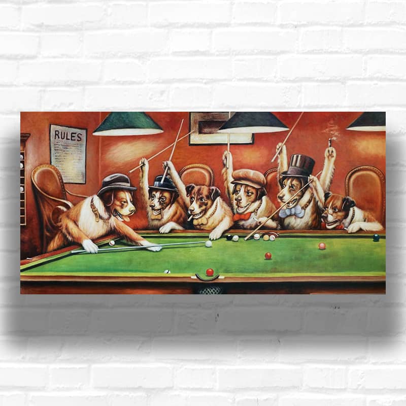 Seven dogs playing pool around a wide green table – and they’re not being subtle about it. One’s leaning into a shot with serious intent. Another’s already got a cue raised in triumph. There’s a top hat, a flat cap, a bow tie, a cigarette. The warm terracotta walls and hanging lamps give the whole scene a vintage pool hall atmosphere that’s unmistakably American. This isn’t just a famous art reproduction; it’s classic American art that’s been turning heads for over a century. The horizontal canvas composition makes it genuinely built for wide walls.
