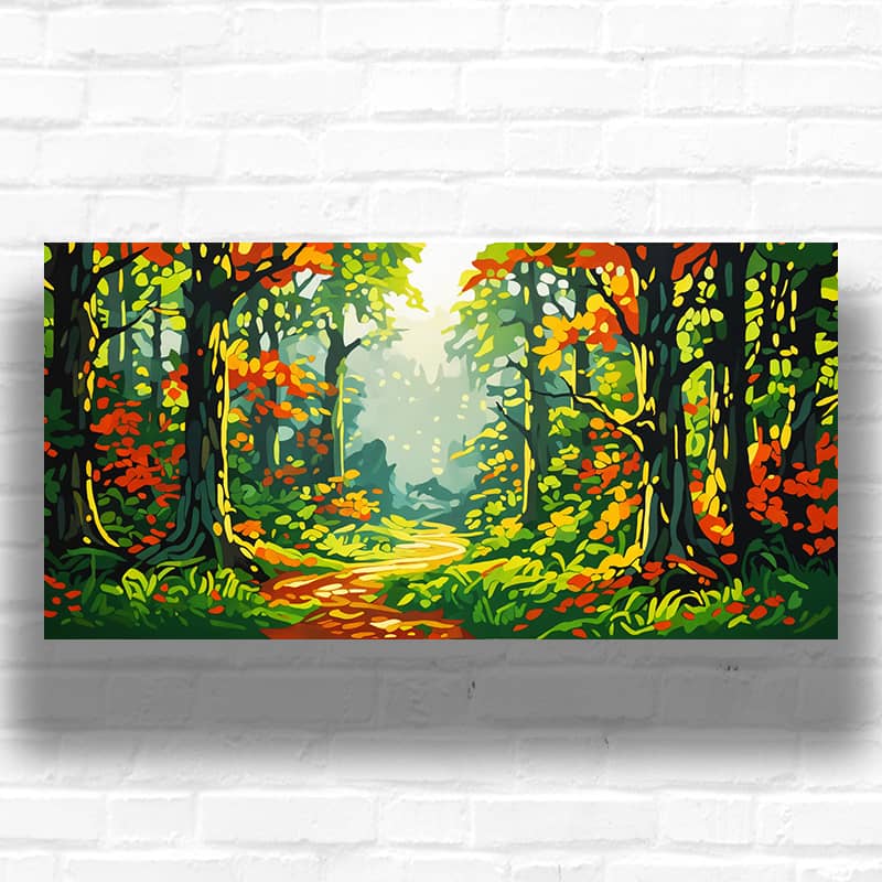 The Summer Forest paint by numbers shows a woodland scene, where the dirt path curves gently between dense trees. Light filters from above, creates a haze effect in the distance. The foliage is painted in distinct color blocks of chartreuse, tangerine, crimson, and emerald. Each sheet is simplified to a shape that is easy to paint. This giant canvas captures natural beauty without demanding botanical accuracy, making it approachable for adults seeking a relaxing art hobby.