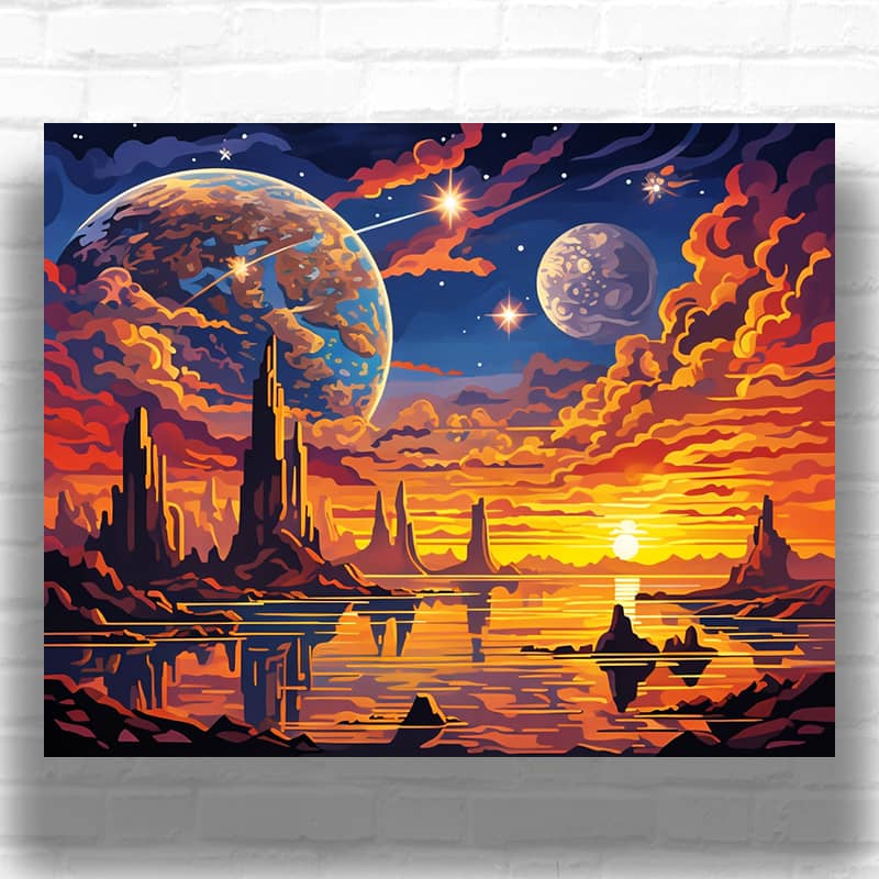 Three Planets on the Galactic Coast – paint by numbers kit, this modern artwork shows three celestial bodies hover above an alien shoreline where orange and purple skies bleed into reflective water. Towering rock formations frame a landscape that feels both distant and familiar… the kind of place you’d find in dreams or old sci-fi paperbacks. Warm sunset tones contrast against deep cosmic blues, creating depth you can almost step into.