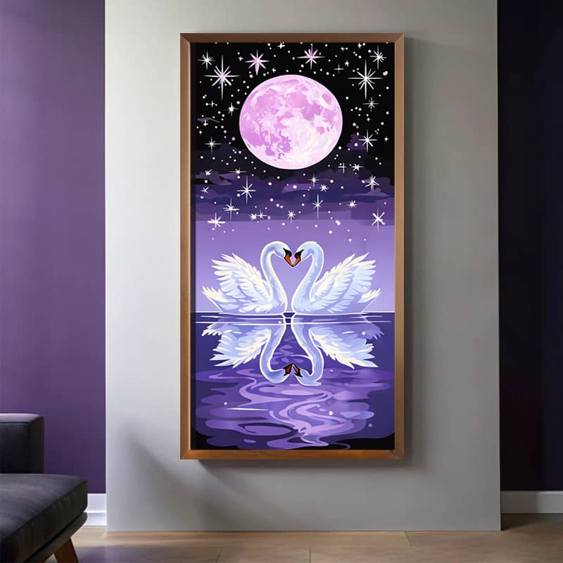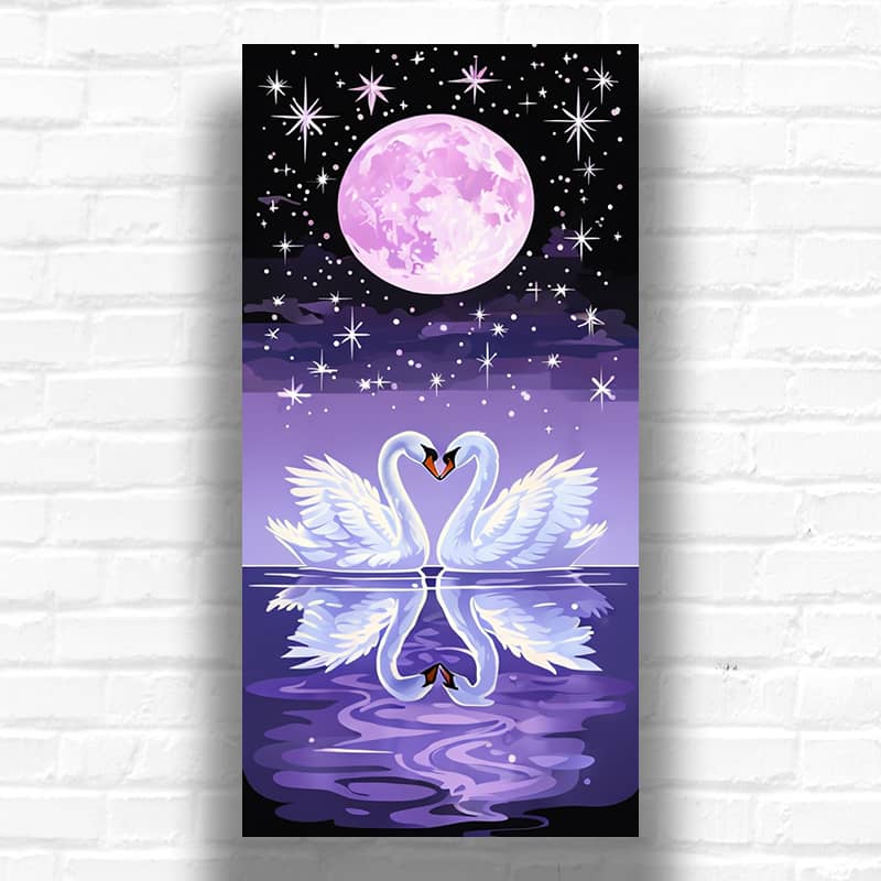 The beautiful nighttime scene includes a deep dark sky dotted with glittering white stars of varied size. Some stars are portrayed as plain dots, while others feature starburst sparkles that provide a magical effect. A calm lake fades into deep purple to brighter lavender tones, producing an ideal mirror reflection of the swans, moon, and stars. Gentle ripples and water patterns provide movement and depth. This paint by numbers design combines romantic symbolism with celestial beauty, making it ideal large format art for creating emotionally romantic wall art.