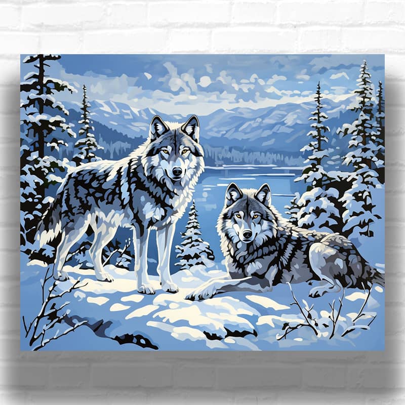 This artwork of Two Wolves – paint by numbers kit show two wolves in a winter landscape. One wolf is standing while the other is lying down in the snow. They are surrounded by pine trees and a body of water is visible in the background. The sky has a bluish hue with some clouds. See more beautiful wolves paintings in our last collection of paint by numbers for adults wolves.