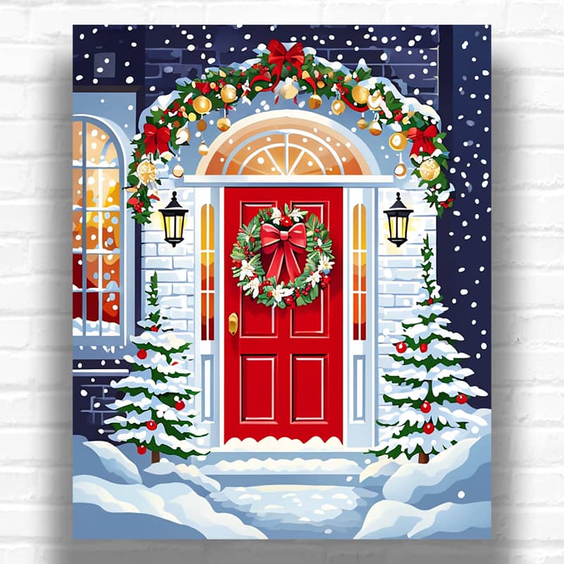 Welcome to the Christmas Paint by Numbers Kit – Festive Red Door Holiday Scene
