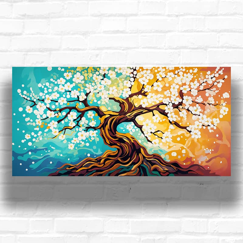 This very large paint by numbers shows a white blooming tree rendered in a modern abstract style. The horizontal canvas features a twisted trunk. It curves dramatically throughout the composition, and dark bark accented with golden tones. White flowers bloom on every branch, creating a floral painting, showing the renewal of nature. The background shifts from cool turquoise to warm amber, framing the blossom tree beautifully.