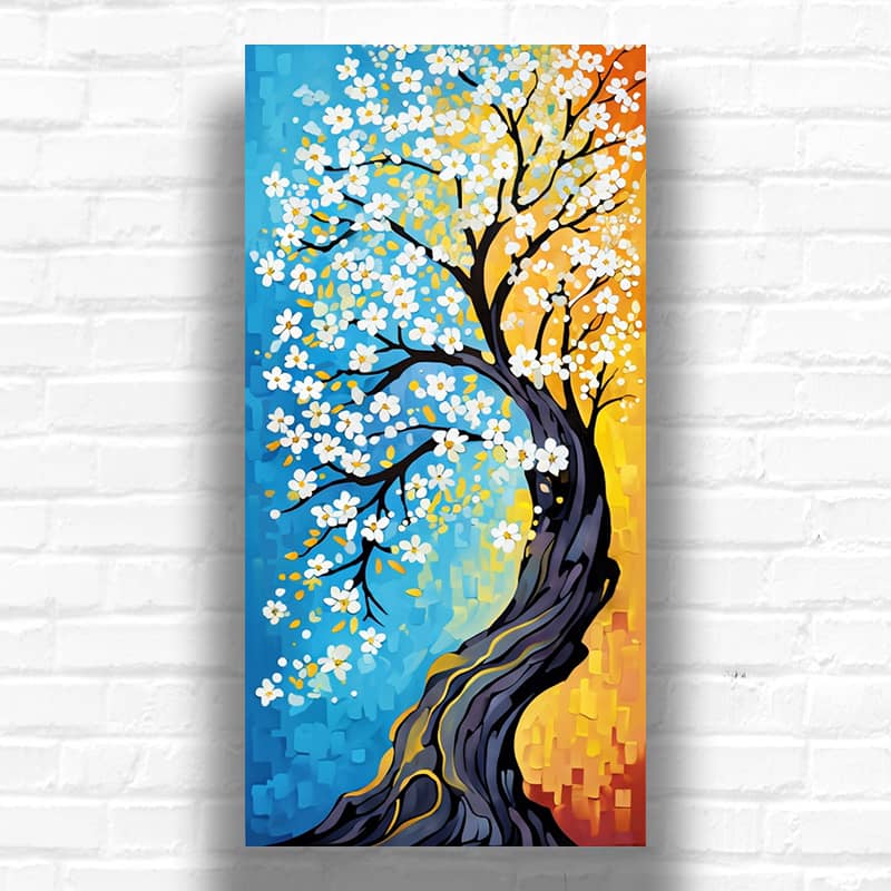 The White Blossom Tree Abstract – paint by numbers kit, this large artwork show a blossoming tree with white flowers. The tree has a tall, thick trunk that curves gracefully, and its branches are covered in many small white flowers. The background is divided, with a blue area on the left suggesting sky, and warmer yellow and orange tones on the right and representing sunlight.