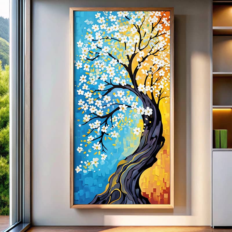 This white blossom tree abstract large painting shows nature through a contemporary style. The vertical canvas displays a gnarled trunk that winds upward, branches heavy with small white flowers. One side is painted in a calm blue color… the other glows in golden amber. It’s a striking example of how floral artwork can embrace minimalist principles without losing warmth.